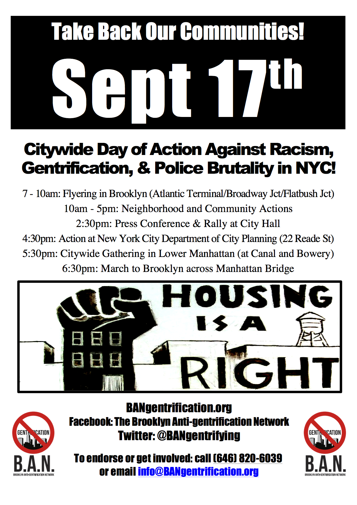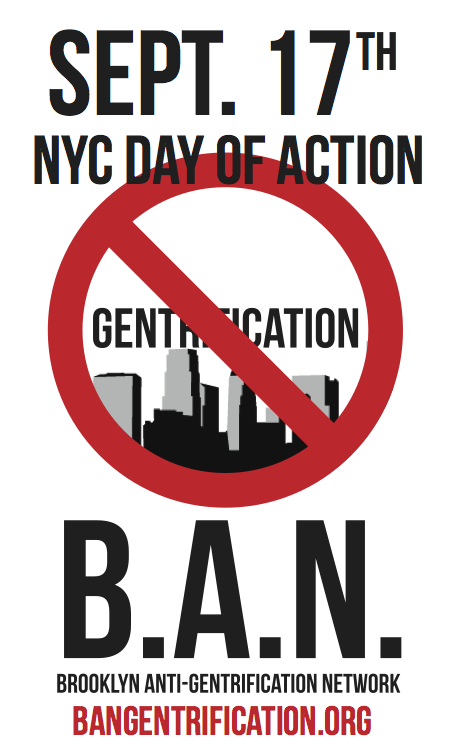 Mobilize with The Brooklyn Anti-gentrification Network – BAN for a Brooklyn-wide March against Racism, Gentrification and Police Violence on SATURDAY September 21st .
