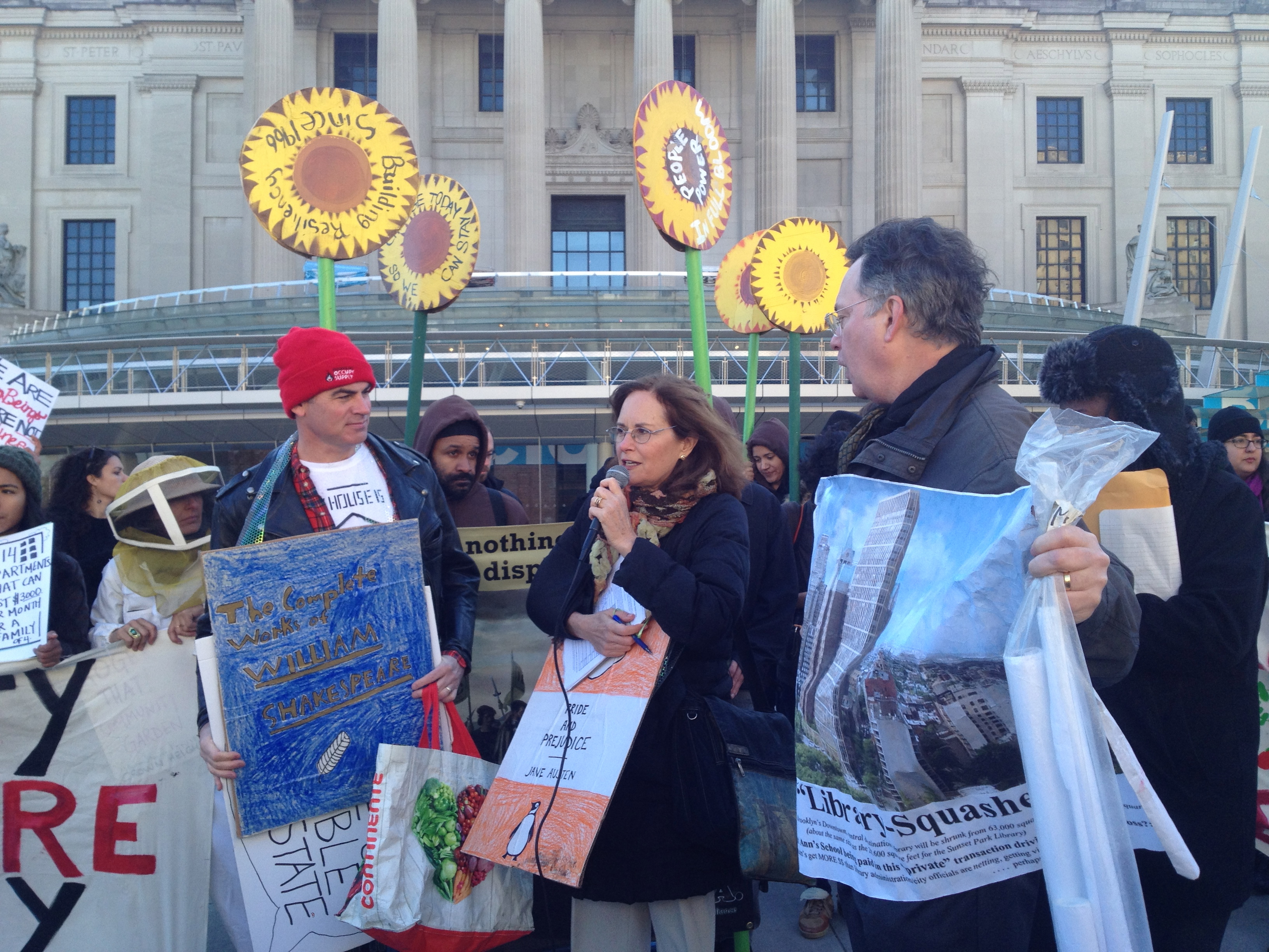 Anne Pruden was attending a ULURP committee meeting at Community Board 9 in Brooklyn.She was standing up holding a protest sign, because the residents had not been allowed on the committee, thus violating the City Charter, and CB9 Bylaws. The police singled her out and arrested her! Later the Police came to the community and declared that she hadn’t been arrested!!! But as you can see she was!!! Now we are demanding that all charges be dropped! This just oppression of our neighbors and political activists who are putting their lives on the line for us!